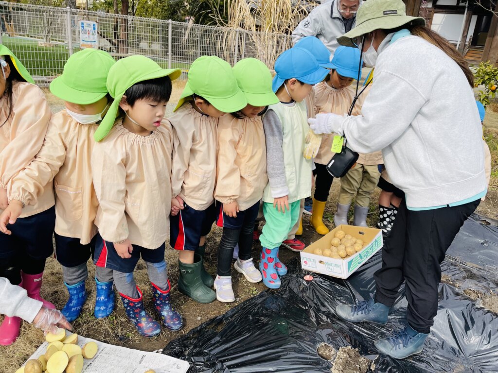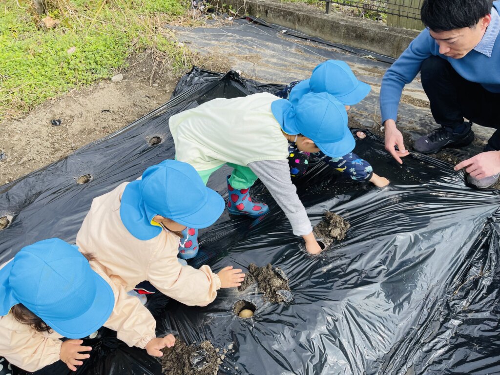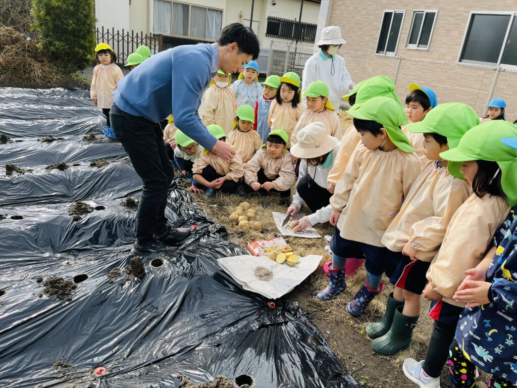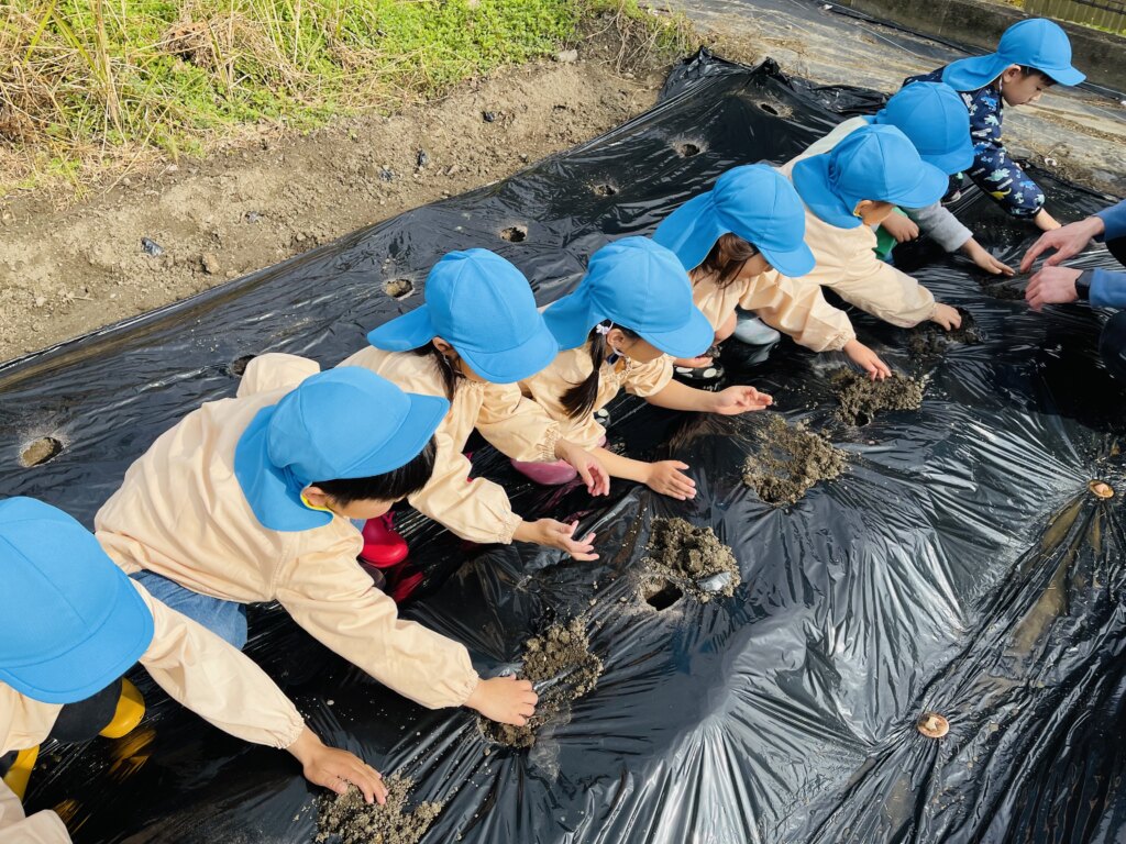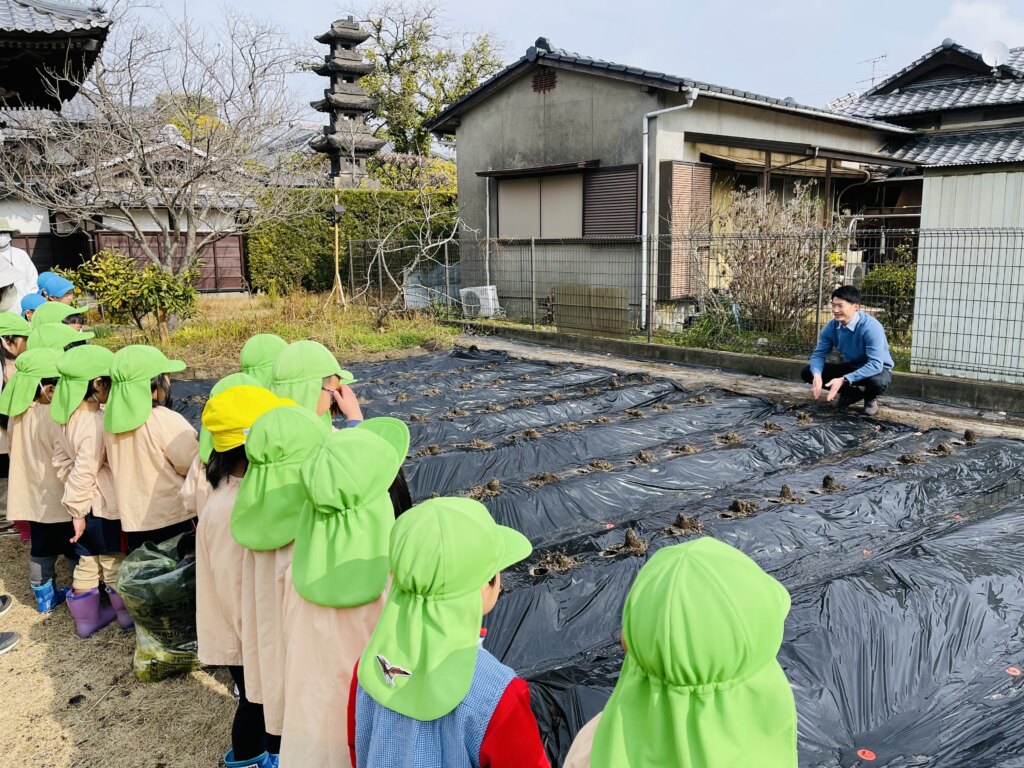 今日は、八千把こども園の年中さんがお寺の畑にじゃがいもの種芋を植えました。
