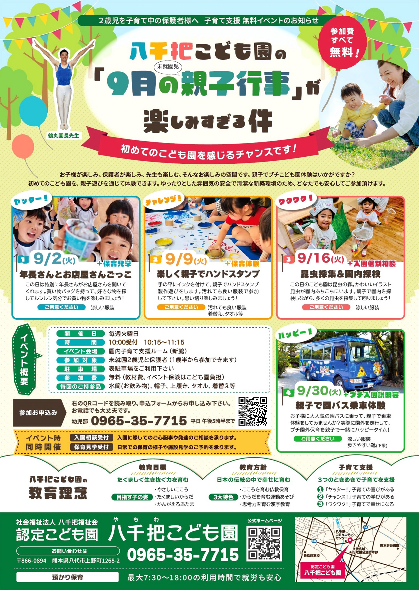日 程 | 9月2日『年長さんとお店屋さんごっこ』無料イベント❗️ 9月9日『親子で楽しくハンドスタンプ』無料イベント❗️ 9月16日『イラスト昆虫採集 & 園内探検』無料イベント❗️ 9月30日『親子で園バス乗車体験』無料イベント❗️